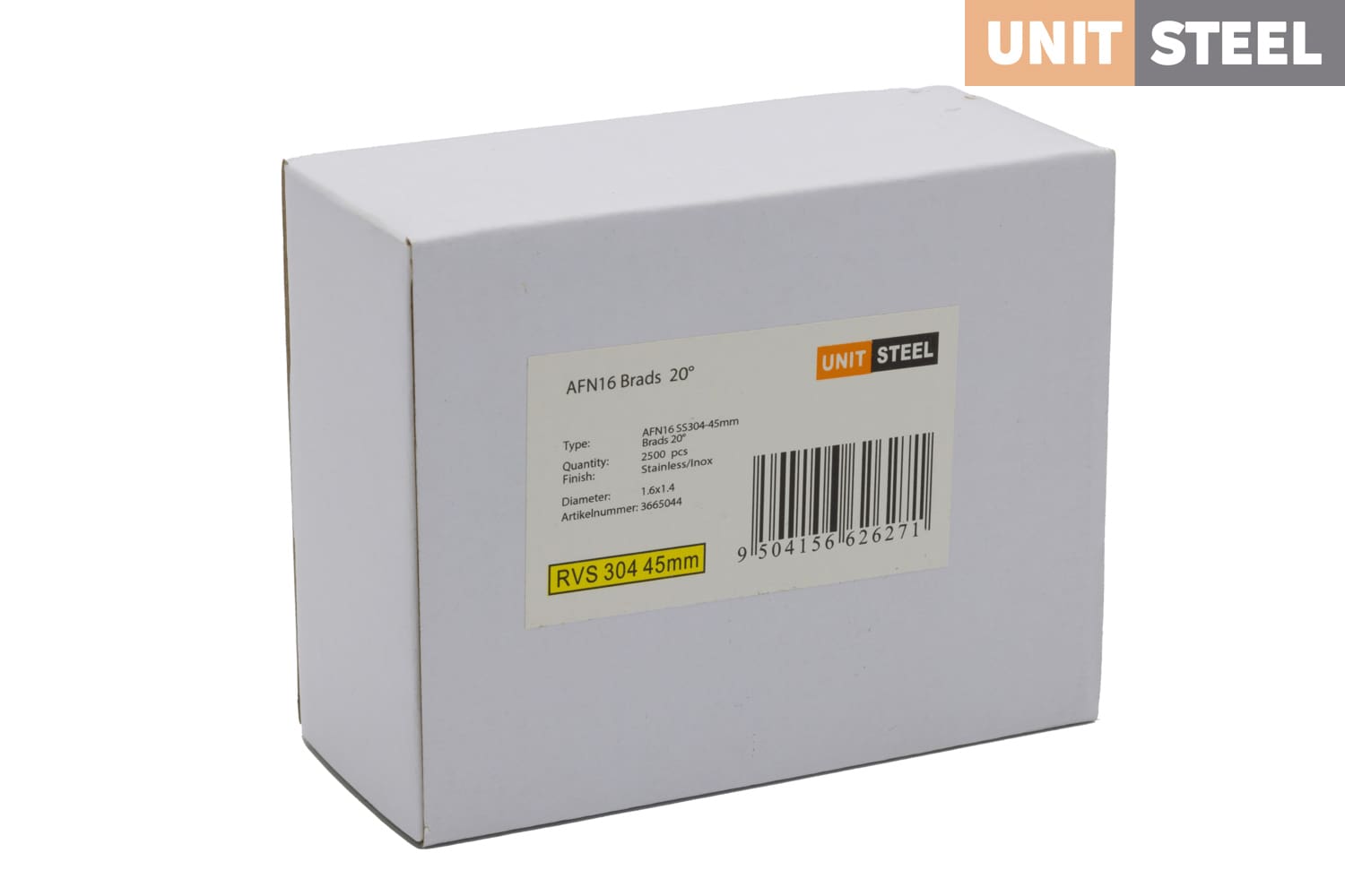 De schuine brads van Unitsteel zijn schuine brads met een dikte van 1.6mm. Deze spijker is verkrijgbaar in de lengte 25mm tot en met 63mm. De spijkers staat onder een hoek van 20 graden en zijn zowel in gegalvaniseerd staal als in RVS verkrijgbaar. Deze spijkers zijn een alternatief voor de DeWalt schuine brads 20º, de Paslode AF16 Brads en de Kitpro FNP Brads.