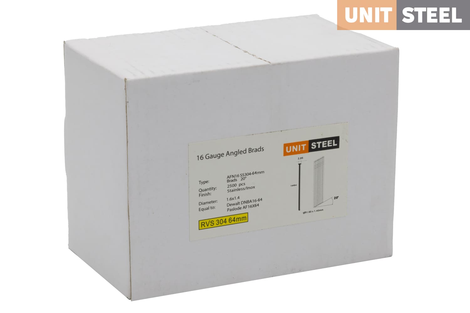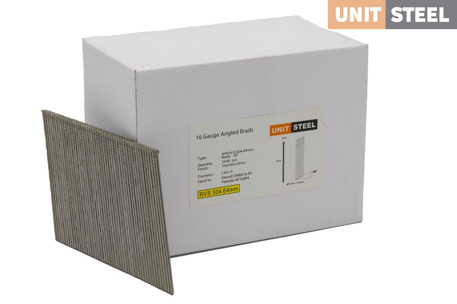 De schuine brads van Unitsteel zijn schuine brads met een dikte van 1.6mm. Deze spijker is verkrijgbaar in de lengte 25mm tot en met 63mm. De spijkers staat onder een hoek van 20 graden en zijn zowel in gegalvaniseerd staal als in RVS verkrijgbaar. Deze spijkers zijn een alternatief voor de DeWalt schuine brads 20º, de Paslode AF16 Brads en de Kitpro FNP Brads.