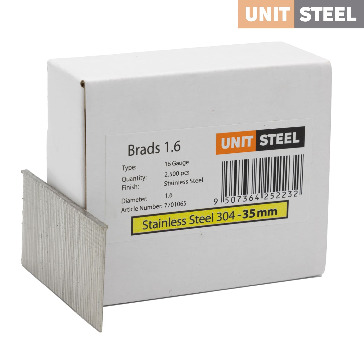 UnitSteel Brads 1,6X35mm RVS: Met een lengte van 35mm zijn deze RVS UnitSteel Brads ideaal voor gebruik in buitenomgevingen waar betrouwbaarheid en duurzaamheid vereist zijn. Dankzij hun roestvrijstalen constructie bieden ze uitstekende corrosiebestendigheid en zijn ze bestand tegen de uitdagingen van buitentoepassingen. Gebruik deze brads bijvoorbeeld voor de bevestiging van dakranden, gevelbekleding en constructie van tuinmeubilair in buitenruimtes.