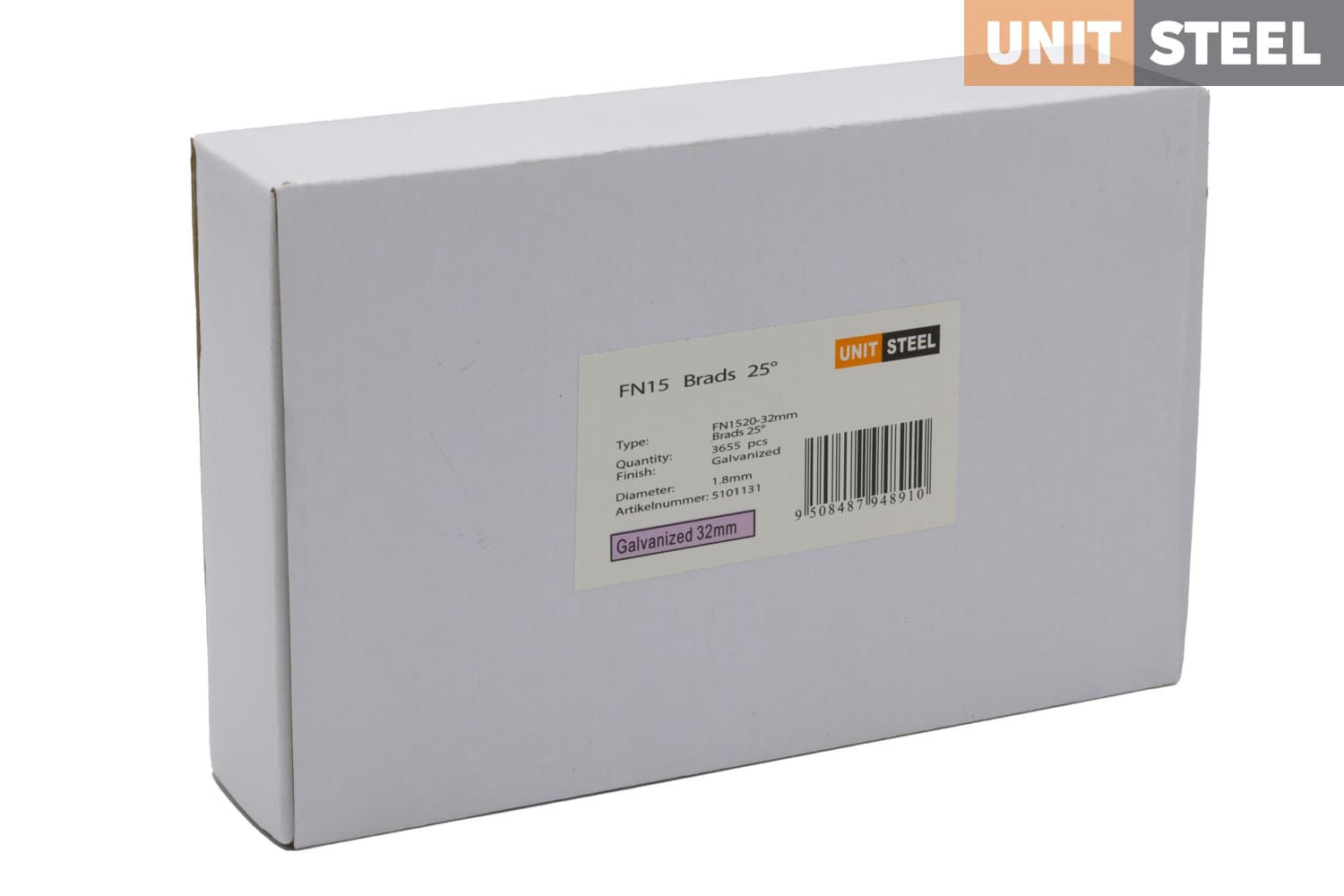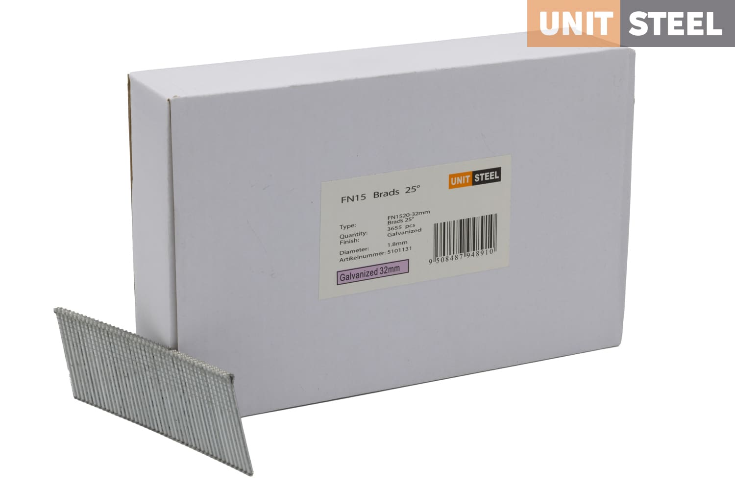UnitSteel Brads FN1520 (N62) 32mm: Met een hoek van 25 graden zijn deze 32mm UnitSteel Brads FN1520 (N62) ideaal voor bevestigingen in krappe ruimtes. Ze worden veelvuldig gebruikt door glaszetters voor het bevestigen van glaslatten, naast hun toepassing in houtbewerking, afwerking en meubelmontage. Deze brads zorgen voor een solide verbinding en leveren nauwkeurige resultaten op. Vertrouw op de duurzaamheid en kwaliteit van UnitSteel voor professionele bevestigingen.