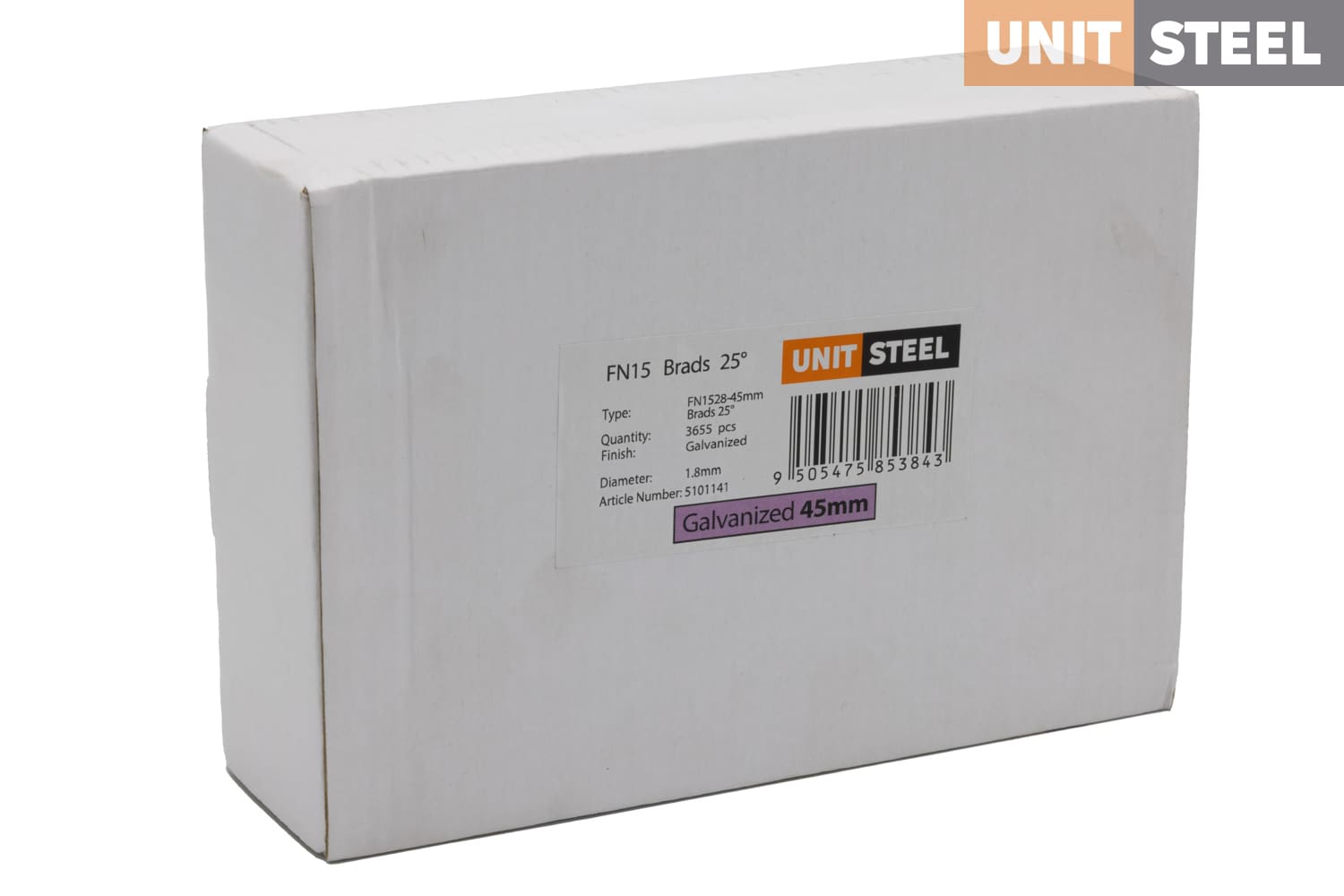 UnitSteel Brads FN1528 (N62) 45mm: Met een hoek van 25 graden en een lengte van 45mm bieden deze UnitSteel Brads FN1528 (N62) ideale bevestigingen in krappe ruimtes. Ze worden veel gebruikt door glaszetters voor het bevestigen van glaslatten en zijn geschikt voor houtbewerking, afwerking, meubelmontage en meer. Deze brads zorgen voor solide verbindingen en leveren nauwkeurige resultaten.
