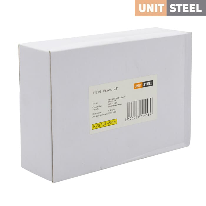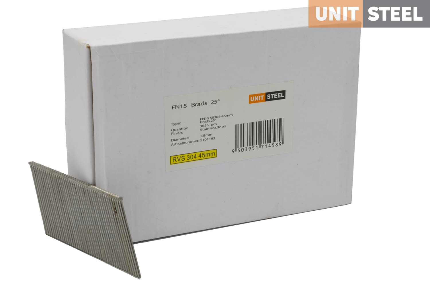 UnitSteel Brads FN1528SS (N62) 45mm RVS: Deze RVS UnitSteel Brads FN1528SS (N62) met een lengte van 45mm en een hoek van 25 graden zijn perfect geschikt voor buiten-toepassingen. Met hun hoogwaardige roestvrijstalen constructie bieden ze uitstekende duurzaamheid en corrosiebestendigheid, zelfs onder de meest uitdagende weersomstandigheden. Gebruik deze brads bijvoorbeeld voor het bevestigen van lijsten, sierlijsten en ander timmerwerk in buitenomgevingen zoals gevelbekleding, tuinconstructies en buitentimmerwerk. Ze zorgen voor stevige verbindingen en een professionele afwerking, waardoor ze betrouwbaar zijn voor buitentoepassingen.