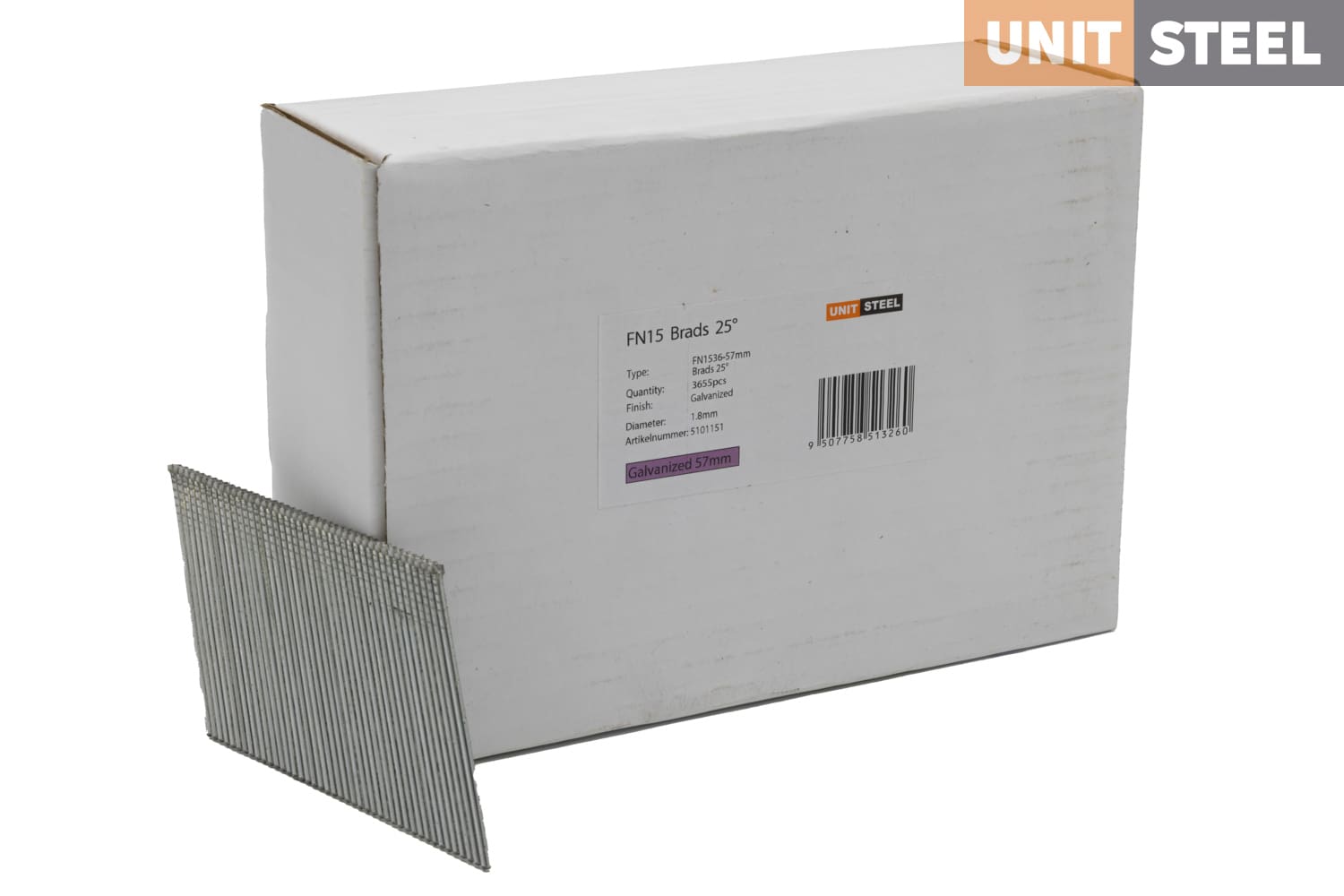 UnitSteel Brads FN1536 (N62) 57mm: Met een hoek van 25 graden en een lengte van 57mm bieden deze UnitSteel Brads FN1536 (N62) betrouwbare bevestigingen in krappe ruimtes. Ze worden veel gebruikt door glaszetters voor het bevestigen van glaslatten, en zijn geschikt voor houtbewerking, afwerking, meubelmontage en meer. Deze brads zorgen voor stevige verbindingen en zijn duurzaam in gebruik. Vertrouw op de duurzaamheid en kwaliteit van UnitSteel voor professionele bevestigingen.