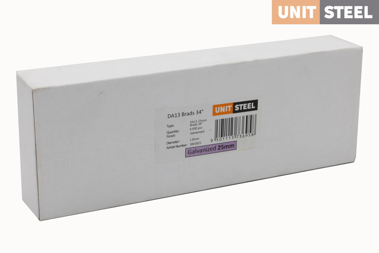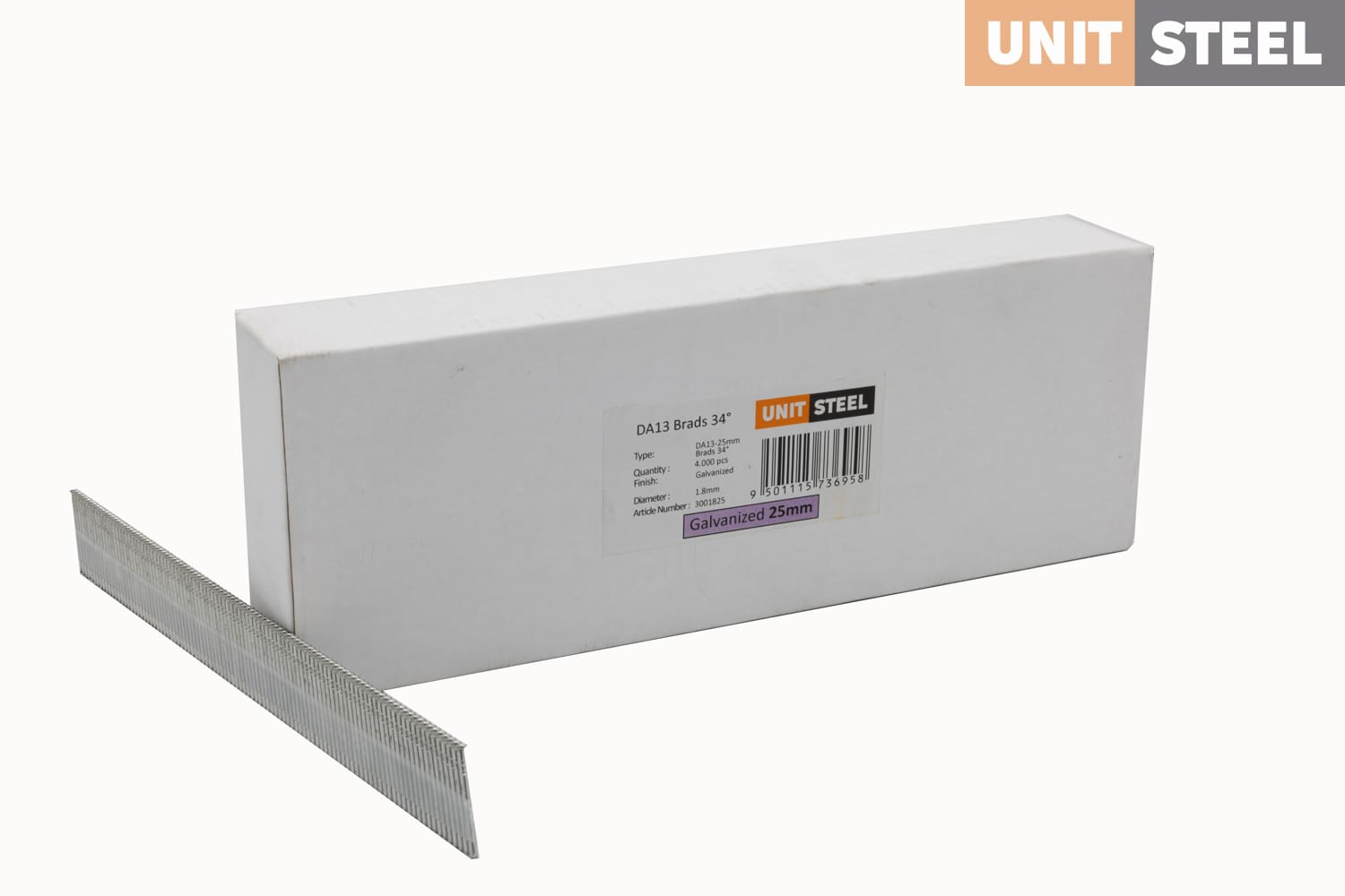 UnitSteel Da Brads 1,8x25mm Gegalvaniseerd DA13EAB: Deze gegalvaniseerde Da Brads van UnitSteel met een lengte van 25mm en een hoek van 34 graden bieden betrouwbare bevestiging voor diverse toepassingen, zoals afwerking van hout, het bevestigen van glaslatten, plinten en andere precisiewerkzaamheden in krappe ruimtes. Kies voor deze duurzame en nauwkeurige bevestigingsoplossing voor sterke verbindingen.