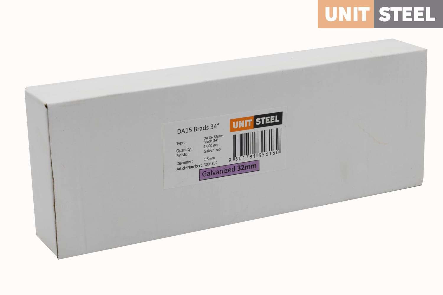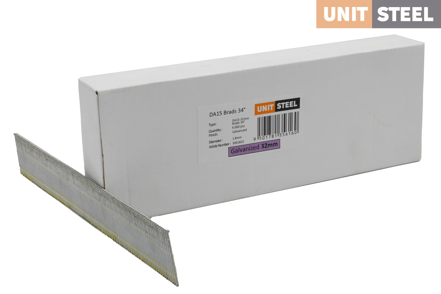 UnitSteel Da Brads 1,8x32mm Gegalvaniseerd DA15EAB: Deze gegalvaniseerde Da Brads van UnitSteel met een lengte van 32mm en een hoek van 34 graden bieden uitstekende bevestiging voor verschillende toepassingen, zoals het bevestigen van glaslatten, plinten, afwerklijsten en andere houtbewerkingstoepassingen in krappe ruimtes. Betrouwbare en duurzame oplossing voor professionele resultaten.