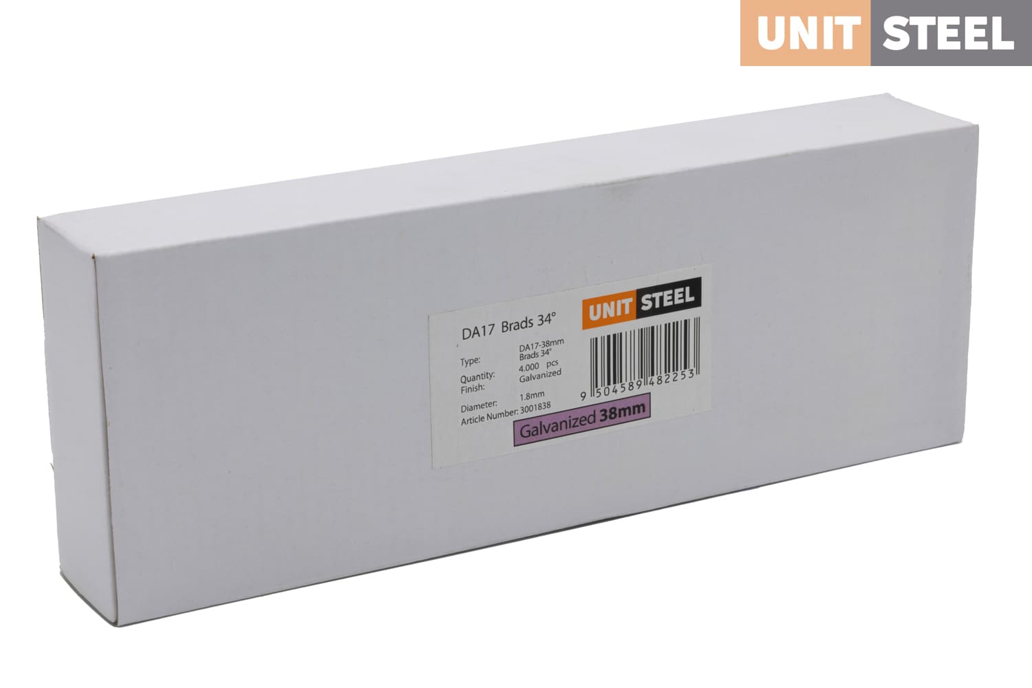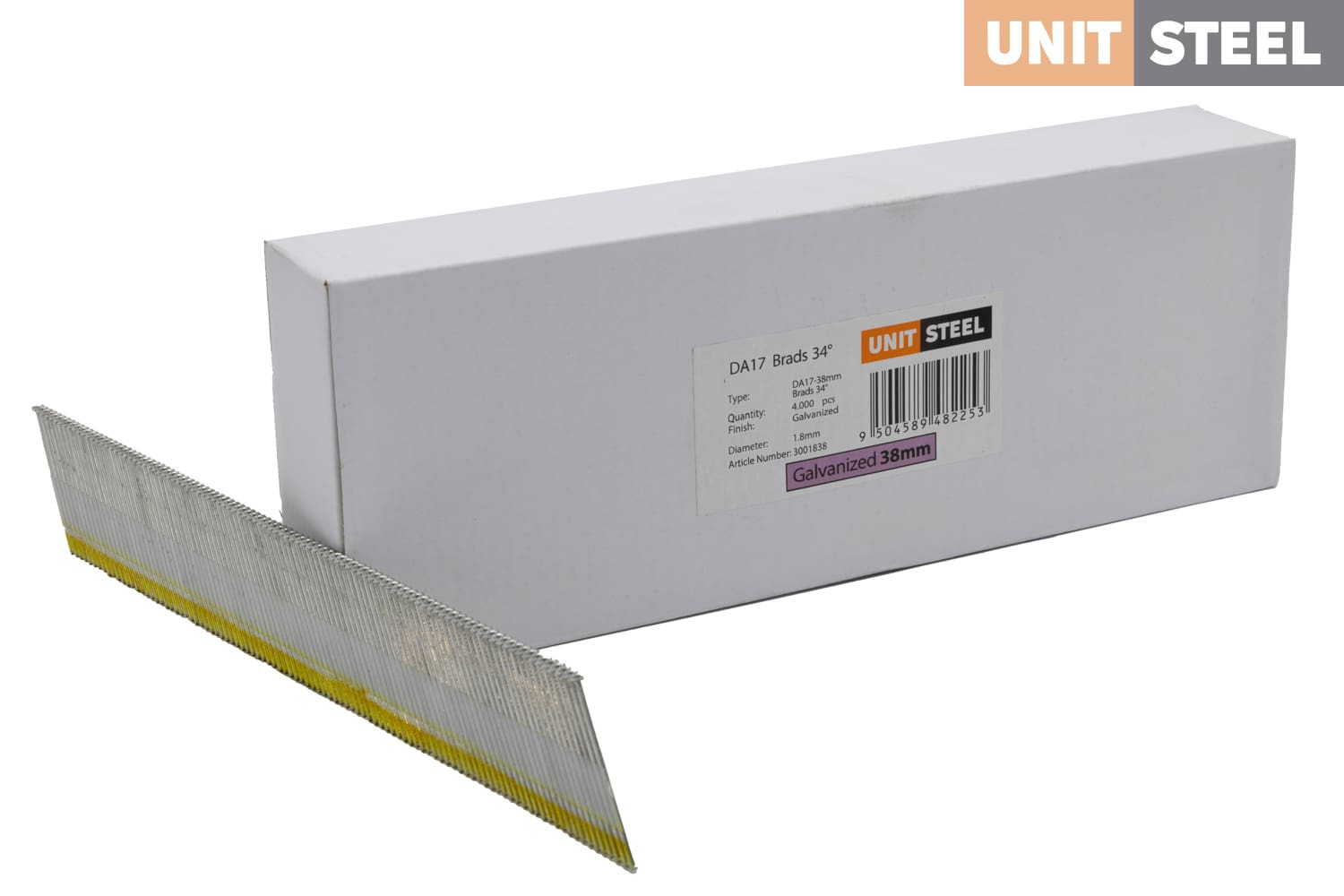 UnitSteel Da Brads 1,8x38mm Gegalvaniseerd DA17EAB: Deze gegalvaniseerde Da Brads van UnitSteel met een lengte van 38mm en een hoek van 34 graden bieden betrouwbare bevestiging voor diverse toepassingen, zoals het bevestigen van glaslatten, plinten, afwerklijsten en andere precisiewerkzaamheden in krappe ruimtes waar een langere lengte en nauwkeurige plaatsing vereist zijn. Kies voor deze duurzame en nauwkeurige oplossing voor sterke verbindingen.