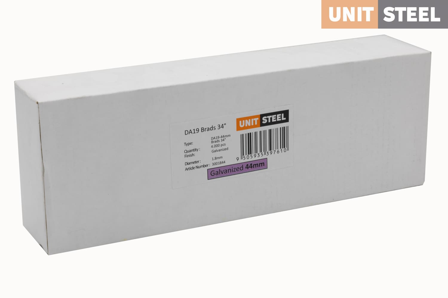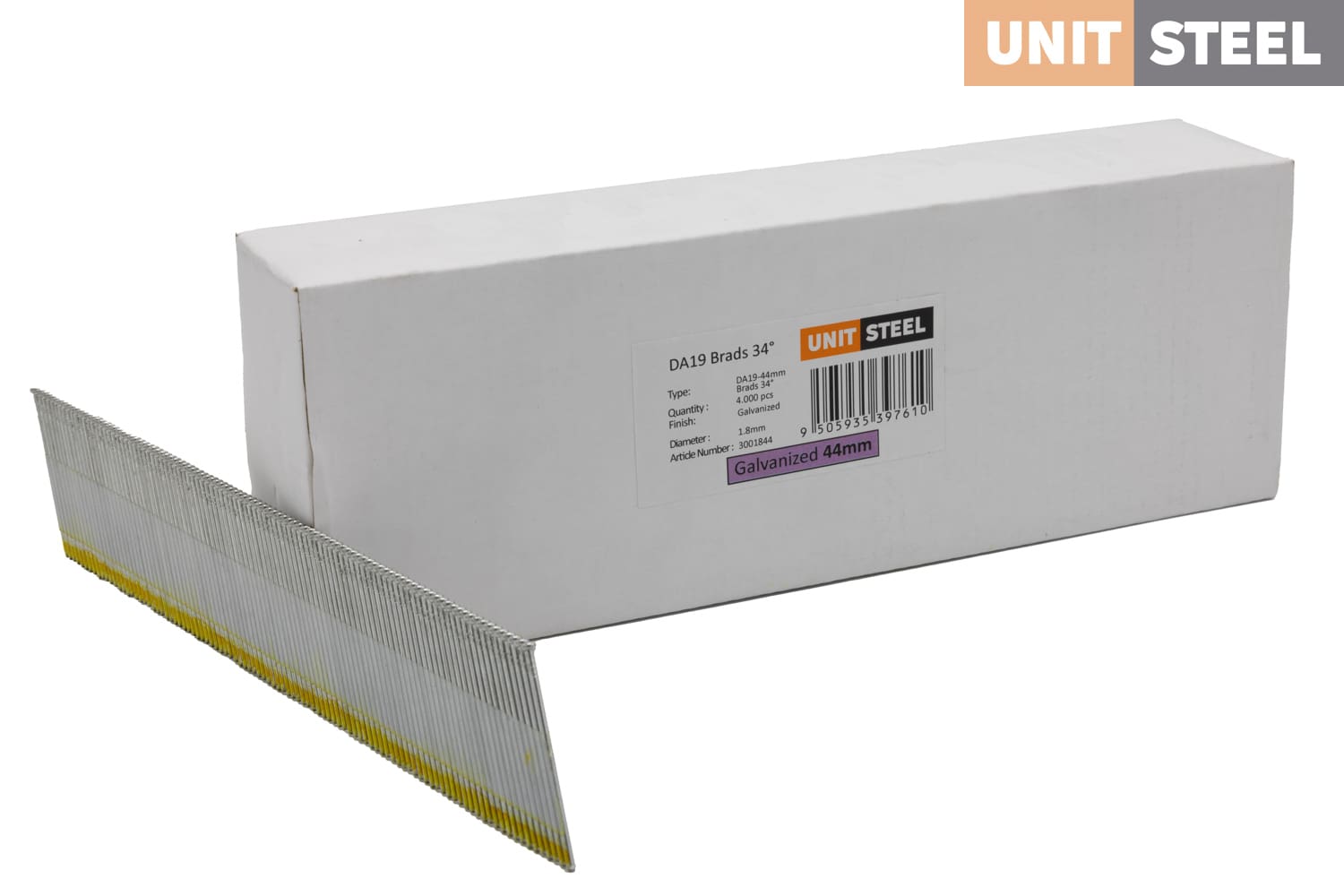 UnitSteel Da Brads 1,8x44mm Gegalvaniseerd DA19EAB: Deze gegalvaniseerde Da Brads van UnitSteel met een lengte van 44mm en een hoek van 34 graden bieden betrouwbare bevestiging voor diverse toepassingen, waaronder bevestigingen in krappe ruimtes. Ze worden veel gebruikt door glaszetters voor het bevestigen van glaslatten, naast het gebruik voor plinten, afwerklijsten en andere precisiewerkzaamheden waar een langere lengte en nauwkeurige plaatsing vereist zijn. Kies voor deze duurzame bevestigingsoplossing voor sterke en precieze verbindingen, zelfs in beperkte ruimtes.