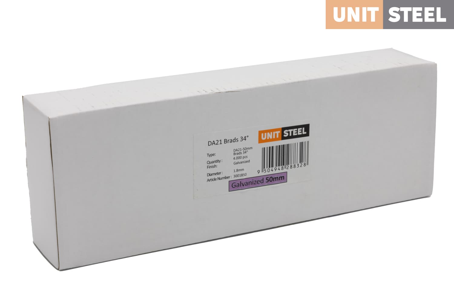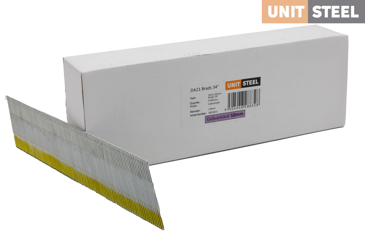 UnitSteel Da Brads 1,8x50mm Gegalvaniseerd DA21EAB: Met een lengte van 50mm en een hoek van 34 graden bieden deze gegalvaniseerde Da Brads van UnitSteel betrouwbare bevestiging voor diverse toepassingen, inclusief bevestigingen in krappe ruimtes. Ze worden veel gebruikt door glaszetters voor het bevestigen van glaslatten, naast het gebruik voor plinten, afwerklijsten en andere houtbewerkingstoepassingen waar nauwkeurige plaatsing en stevigheid vereist zijn. Deze Da Brads zijn duurzaam en nauwkeurig, en zorgen voor sterke verbindingen.
