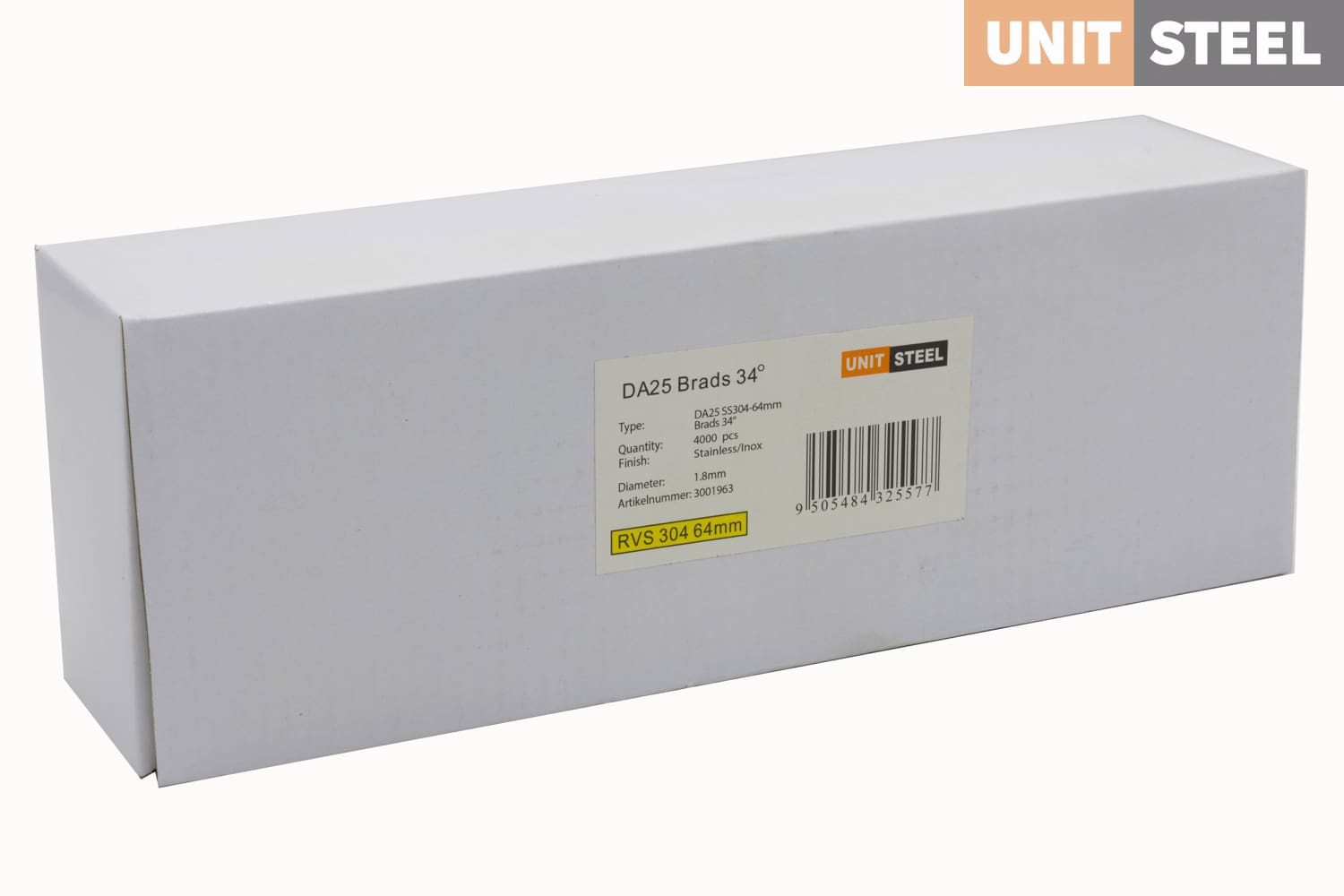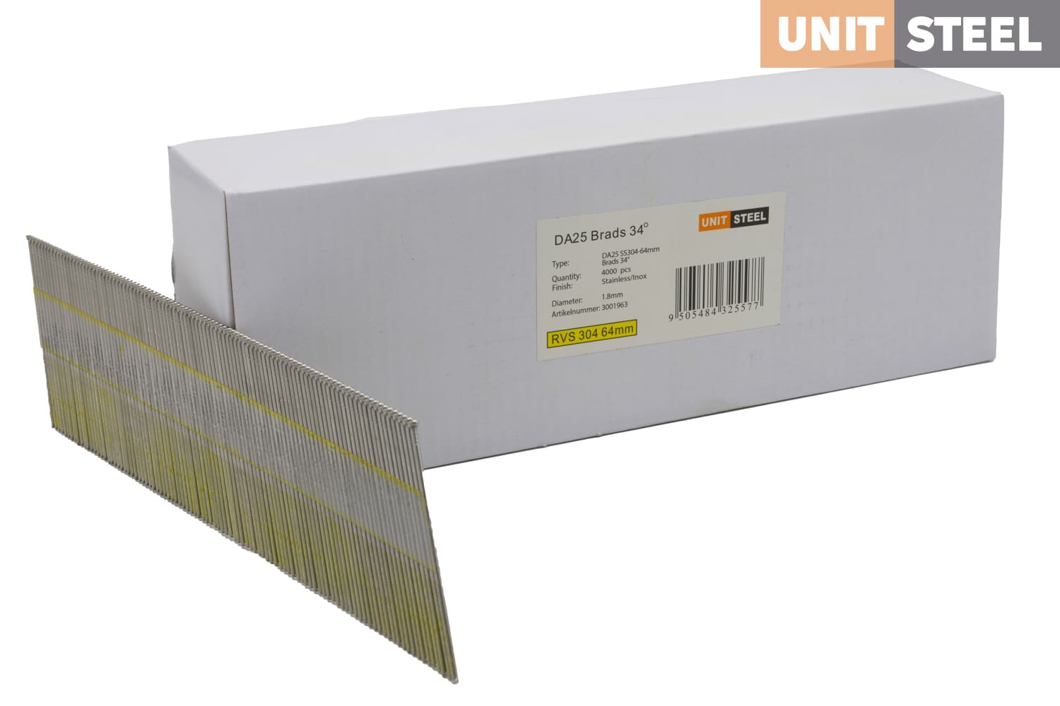 UnitSteel Da Brads 1,8x64mm RVS DA25EGB: Met een lengte van 64mm zijn deze RVS UnitSteel Da Brads geschikt voor veeleisende buitentoepassingen waar extra lengte en betrouwbaarheid vereist zijn. Dankzij hun roestvrijstalen constructie bieden ze uitstekende duurzaamheid en corrosiebestendigheid, zelfs onder de meest uitdagende weersomstandigheden. Gebruik deze DA brads met een 25-graden hoek voor het bevestigen van zwaardere gevelbekleding, buitentimmerwerk en constructie van houten structuren in tuinen en terrassen. Ze zorgen voor stevige verbindingen en een professionele afwerking in veeleisende buitenprojecten.