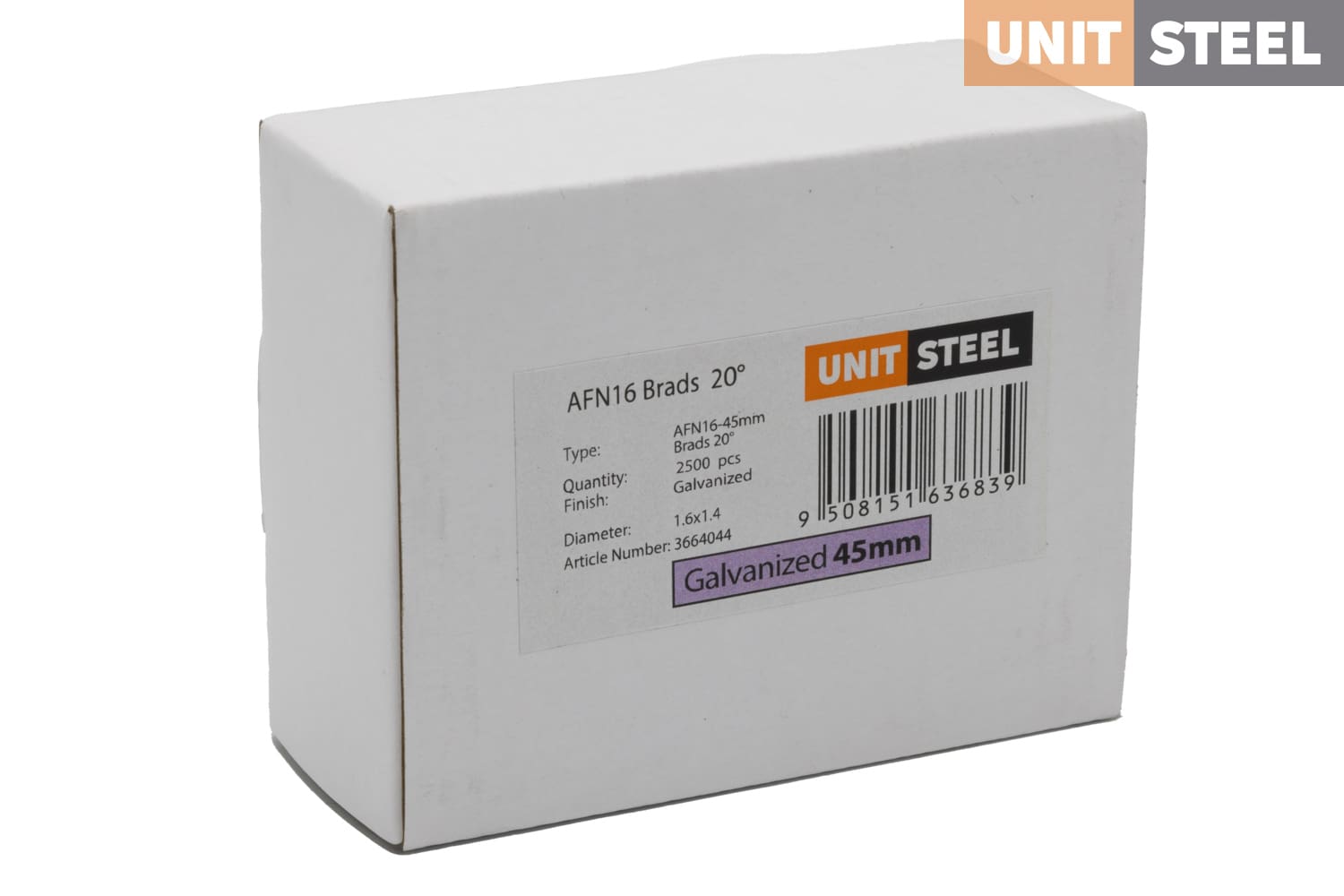 De schuine brads van Unitsteel zijn schuine brads met een dikte van 1.6mm. Deze spijker is verkrijgbaar in de lengte 25mm tot en met 63mm. De spijkers staat onder een hoek van 20 graden en zijn zowel in gegalvaniseerd staal als in RVS verkrijgbaar. Deze spijkers zijn een alternatief voor de DeWalt schuine brads 20º, de Paslode AF16 Brads en de Kitpro FNP Brads.