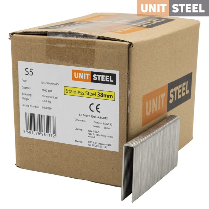 UnitSteel Nieten N17BGBDIN – S5/38mm RVS: Deze 38mm RVS UnitSteel Nieten type N21BGBDIN bieden betrouwbare bevestiging voor zware constructieve toepassingen, beplating, dakbeplating, panlatten, isolatiebevestiging, rekwerk en regels. Geschikt voor tackers van Bostitch, Senco en andere merken. Ze zijn roestbestendig en daardoor zeer geschikt voor buitenwerkzaamheden.