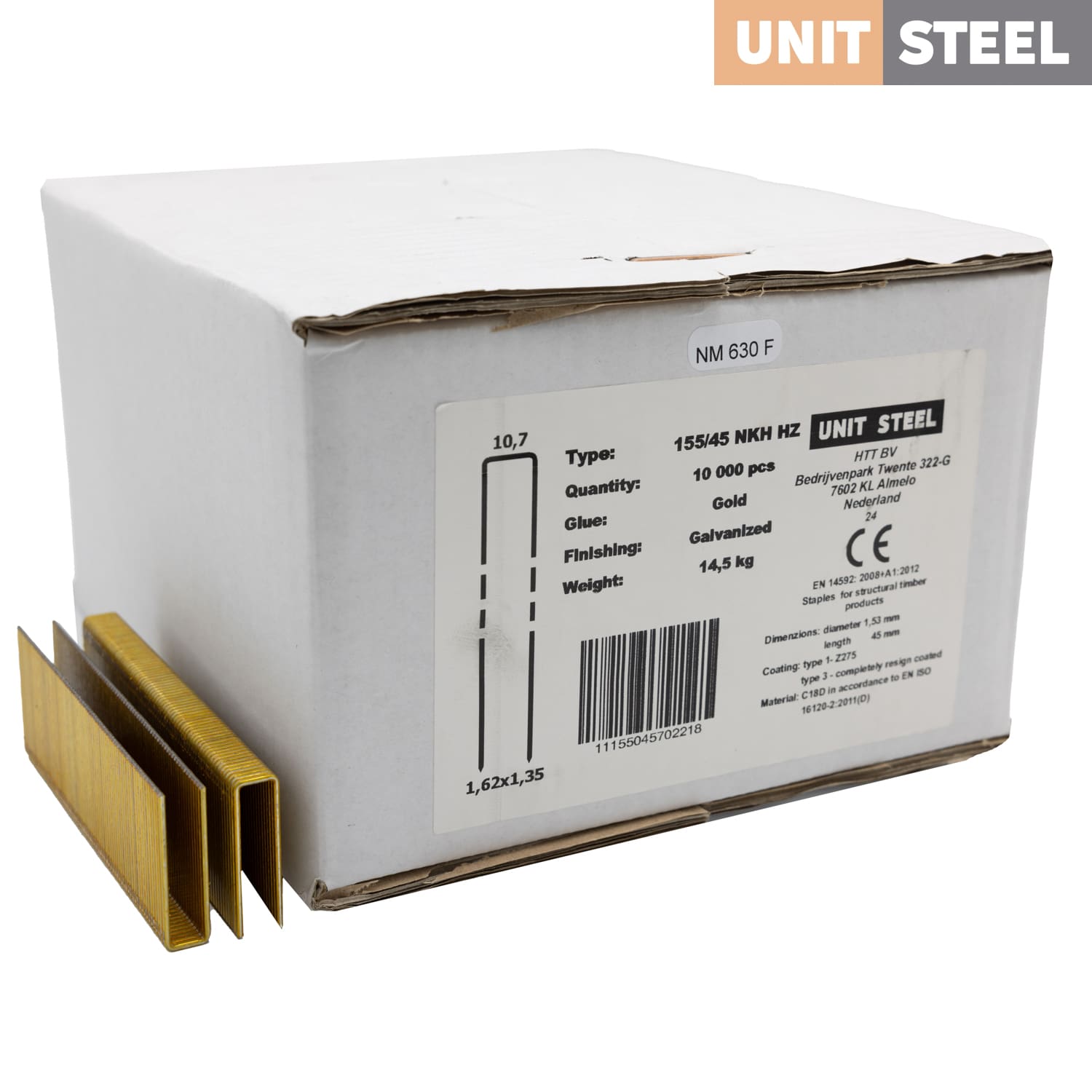 UnitSteel Nieten N19BABB – S5/45mm Gegalvaniseerd: Deze 45mm gegalvaniseerde UnitSteel Nieten N19BABB S5 bieden betrouwbare bevestiging voor zware timmerwerkzaamheden, beplating, dakbeplating, panlatten, isolatiebevestiging, rekwerk en regels. Ze zijn geschikt voor gebruik met tackers van Bostitch, Senco en andere merken. Hun duurzame constructie garandeert betrouwbare prestaties. Als u twijfelt over de compatibiliteit met uw tacker, staan onze experts klaar om uw vragen te beantwoorden.