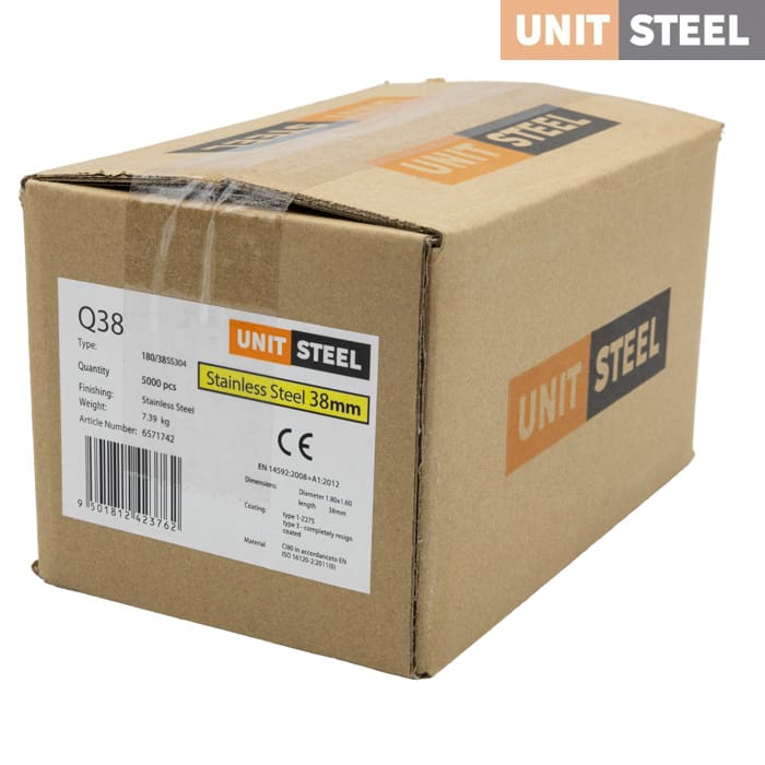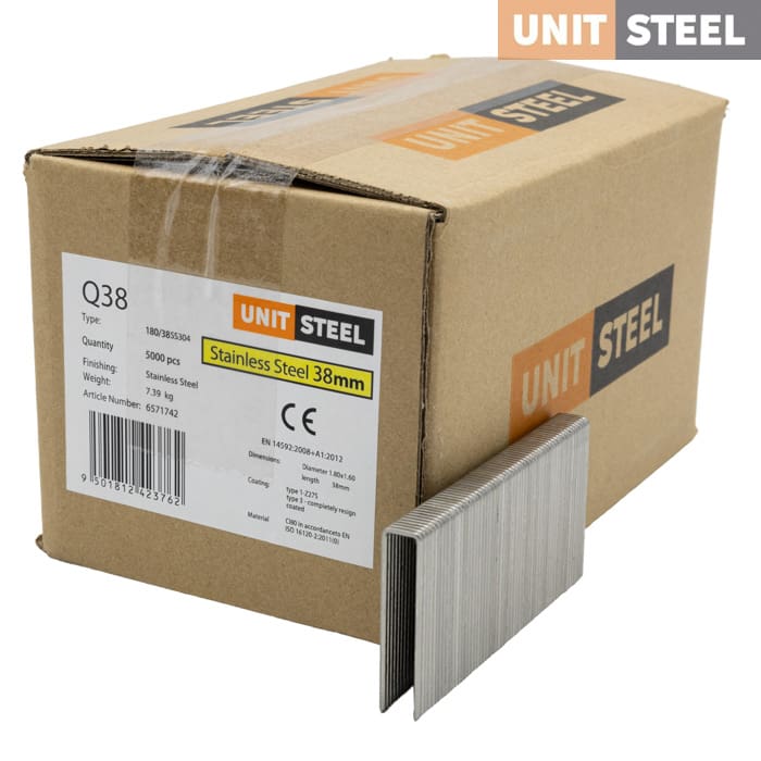 UnitSteel Nieten Q19BGBDIN 38mm RVS: De UnitSteel Nieten Q17BGBDIN met een lengte van 38mm zijn gemaakt van roestvrij staal, wat hen perfect maakt voor buitengebruik. Deze nieten bieden een duurzame en corrosiebestendige bevestigingsoplossing voor zware toepassingen in de timmerindustrie en HSB, zoals beplating, dakbeplating, panlatten, isolatiebevestiging, rekwerk en regels. Ze zijn compatibel met tackers van verschillende merken. Klanten kunnen bij vragen over de compatibiliteit contact opnemen. Vertrouw op hun sterkte en weerstand tegen weersinvloeden voor betrouwbare bevestigingen buiten.