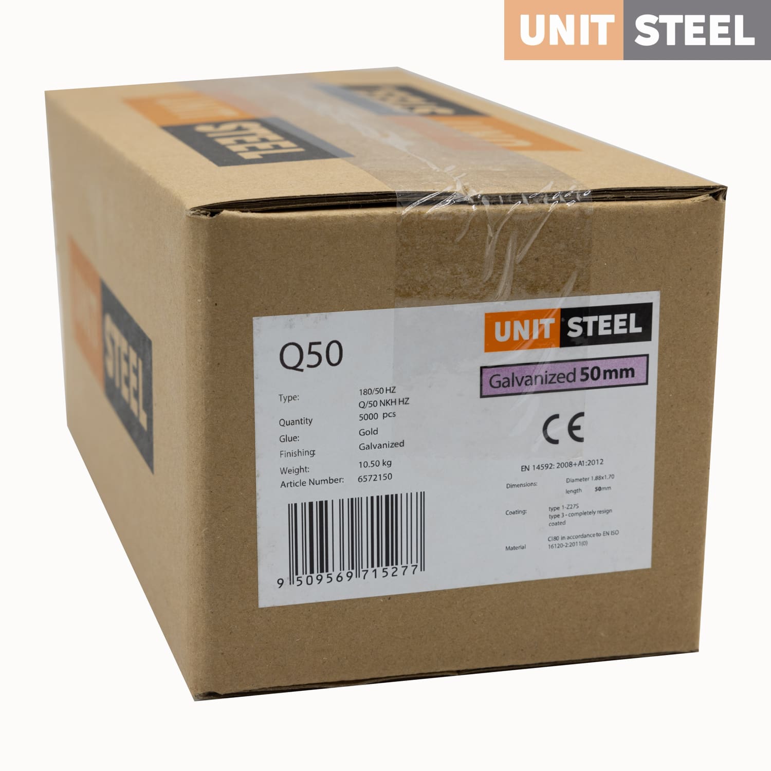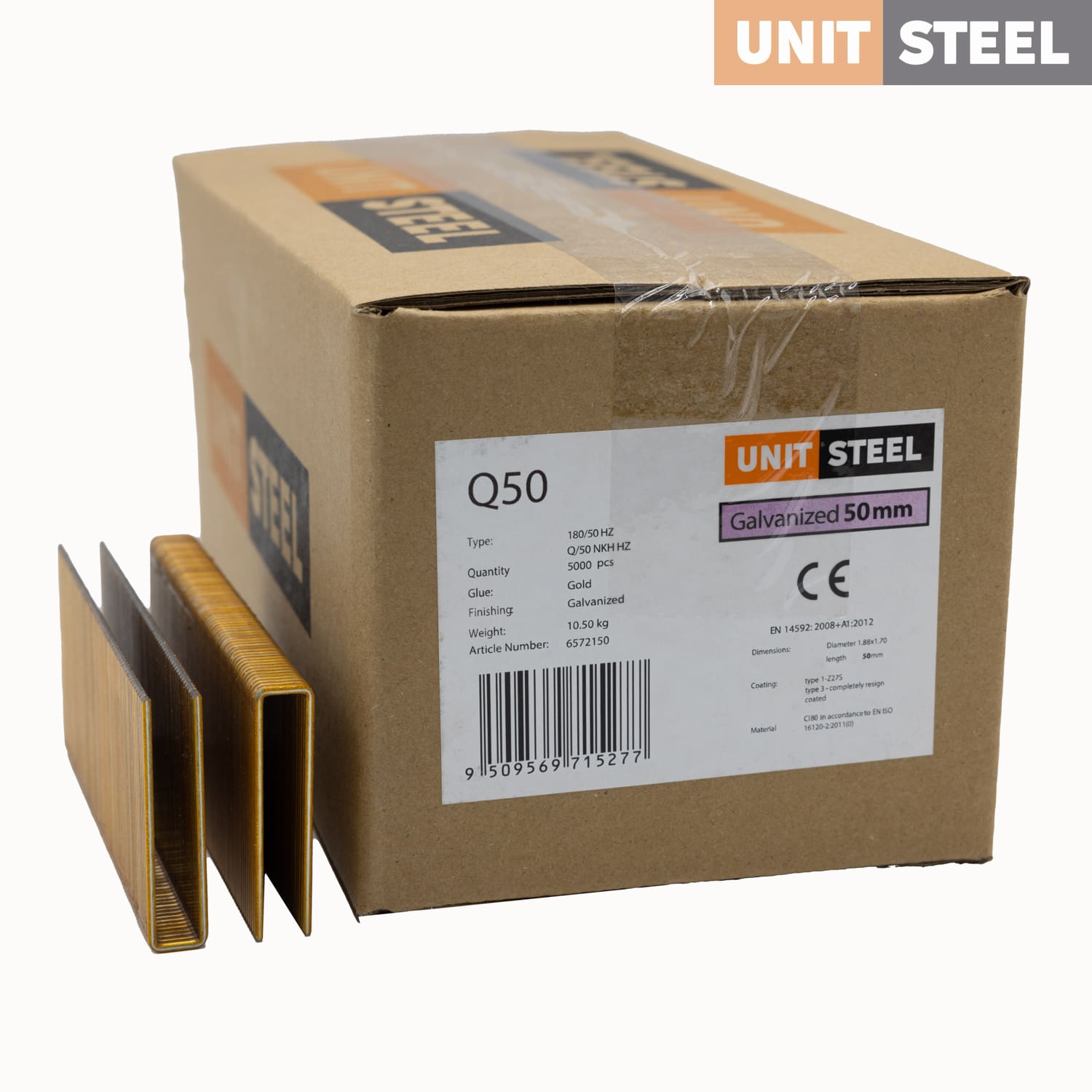 UnitSteel Nieten Q21BABB 50mm Gegalvaniseerd: De UnitSteel Nieten Q21BABB met een lengte van 50mm zijn geschikt voor zware bevestigingswerkzaamheden in de timmerindustrie en HSB. Deze gegalvaniseerde nieten bieden een betrouwbare oplossing voor beplating, dakbeplating, panlatten, isolatiebevestiging, rekwerk en regels. Ze zijn compatibel met tackers van verschillende merken. Klanten kunnen bij vragen over de compatibiliteit contact opnemen. Vertrouw op hun duurzaamheid en stevigheid voor een veilige en solide verbinding.