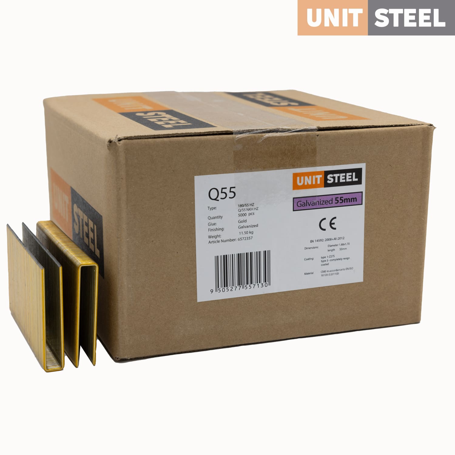 UnitSteel Nieten Q23BABB 55mm Gegalvaniseerd: De UnitSteel Nieten Q23BABB met een lengte van 55mm zijn ontworpen voor zware bevestigingsklussen in de timmerindustrie en HSB. Deze gegalvaniseerde nieten bieden een betrouwbare oplossing voor diverse toepassingen, zoals beplating, dakbeplating, panlatten, isolatiebevestiging, rekwerk en regels. Ze zijn compatibel met tackers van verschillende merken. Klanten kunnen bij vragen over de compatibiliteit contact opnemen. Vertrouw op hun duurzaamheid en stevigheid voor een veilige en solide verbinding.
