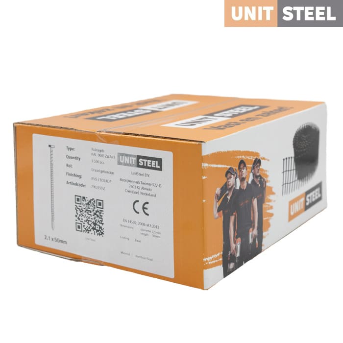 UnitSteel Ringnagels 2,1X50mm Geringd / RVS / Bolkop / Zwart: Creëer een stijlvolle en duurzame afwerking met de UnitSteel Ringnagels 2,1X50mm in zwart, met RVS en bolkop. Deze nagels bieden duurzaamheid, esthetiek en betrouwbaarheid in één. Hun geringde vorm zorgt voor een stevige grip en voorkomt dat de nagels losraken. Met hun roestvrijstalen samenstelling en zwarte coating zijn ze geschikt voor buitengebruik en gevelbekleding, waarbij ze een elegante en duurzame afwerking bieden. Kies voor de UnitSteel Ringnagels 2,1X50mm voor hoogwaardige afwerkingen met een vleugje stijl. Bij vragen kunt u altijd contact met ons opnemen.