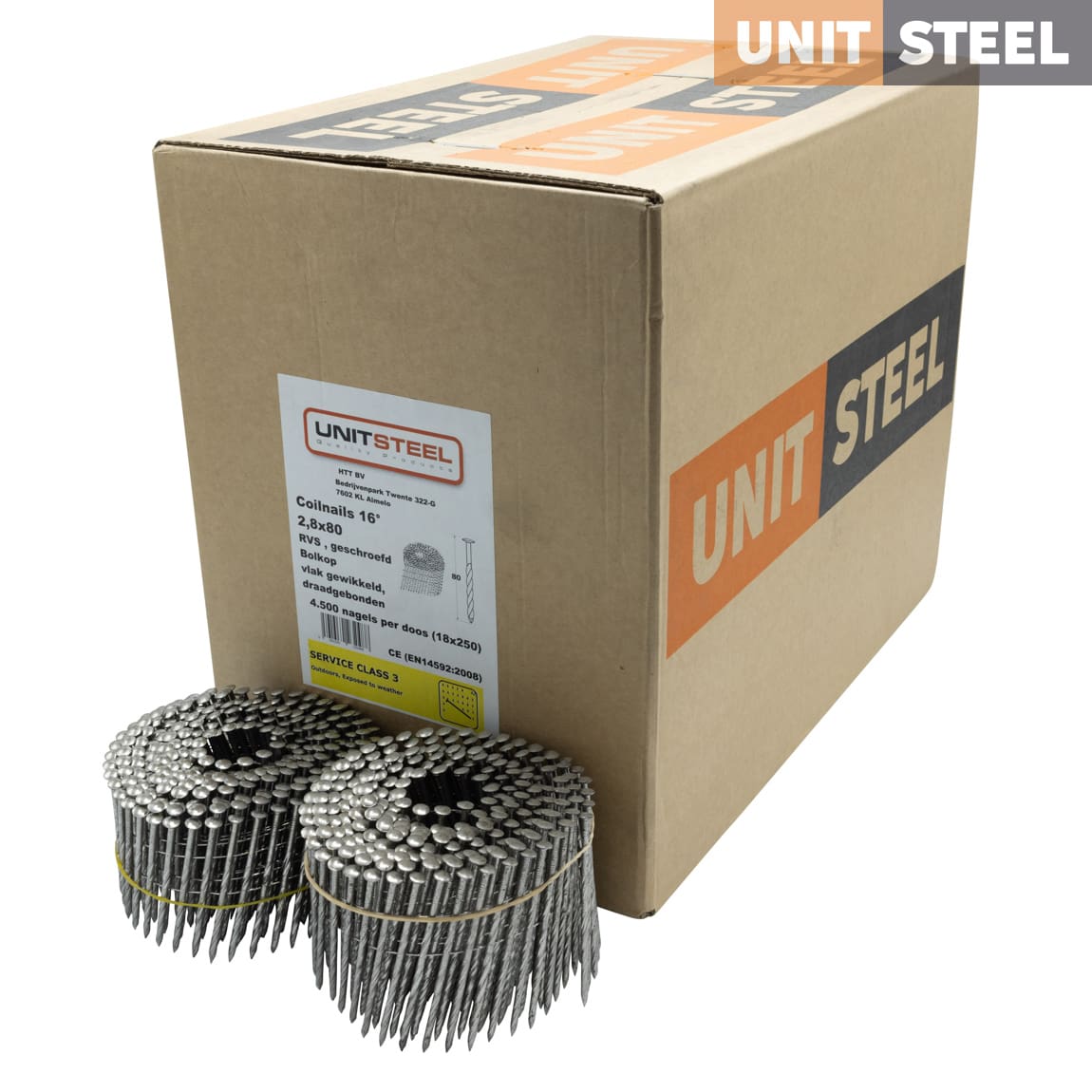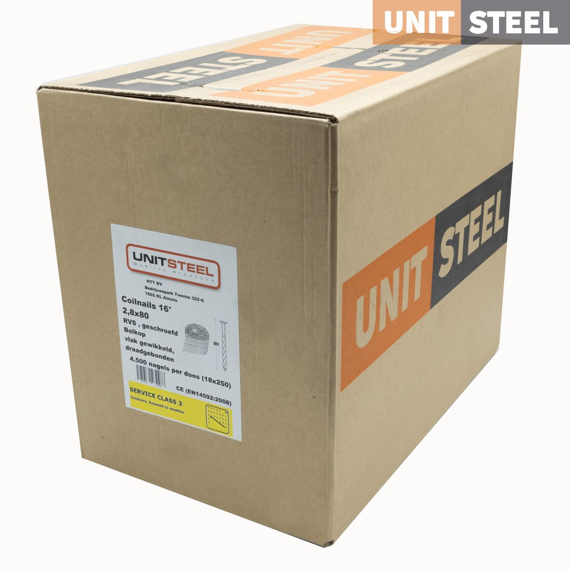 UnitSteel Ringnagels 2,8X80mm Geschroefd RVS Bolkop: De UnitSteel Ringnagels 2,8X80mm zijn geschroefde nagels met een bolle kop, vervaardigd uit hoogwaardig roestvrij staal (RVS). Met een lengte van 80mm zijn deze nagels ideaal voor toepassingen waar een grotere lengte vereist is, zoals bij houtskeletbouw en dakbedekking. Dankzij de geschroefde schacht bieden ze een nauwkeurige verbinding en een professionele afwerking. Vertrouw op UnitSteel voor hoogwaardige RVS bevestigingsmaterialen. Bij vragen over de compatibiliteit met jouw tacker of andere zaken, aarzel niet om contact met ons op te nemen.