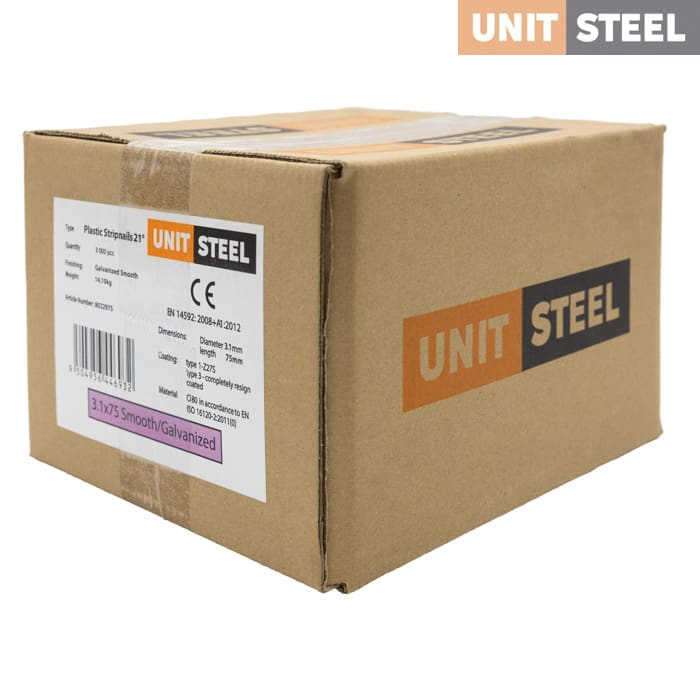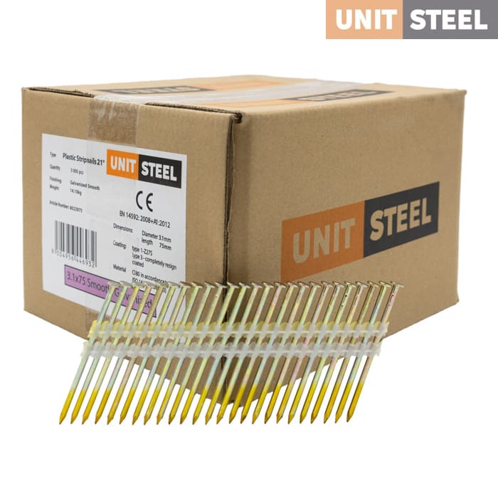 Deze UnitSteel RondKop stripnagels van 3,1x75mm met een hoek van 21º en een ronde kop zijn perfect voor verfijnde interieur- en meubelconstructie. Hun gladde afwerking biedt een precieze en nette bevestiging, ideaal voor het monteren van meubels, installeren van keukenkasten en bevestigen van houten betimmeringen. De klant kan altijd contact met ons opnemen voor vragen; we staan klaar om te helpen.