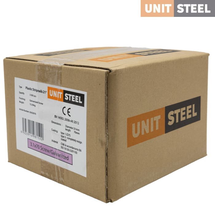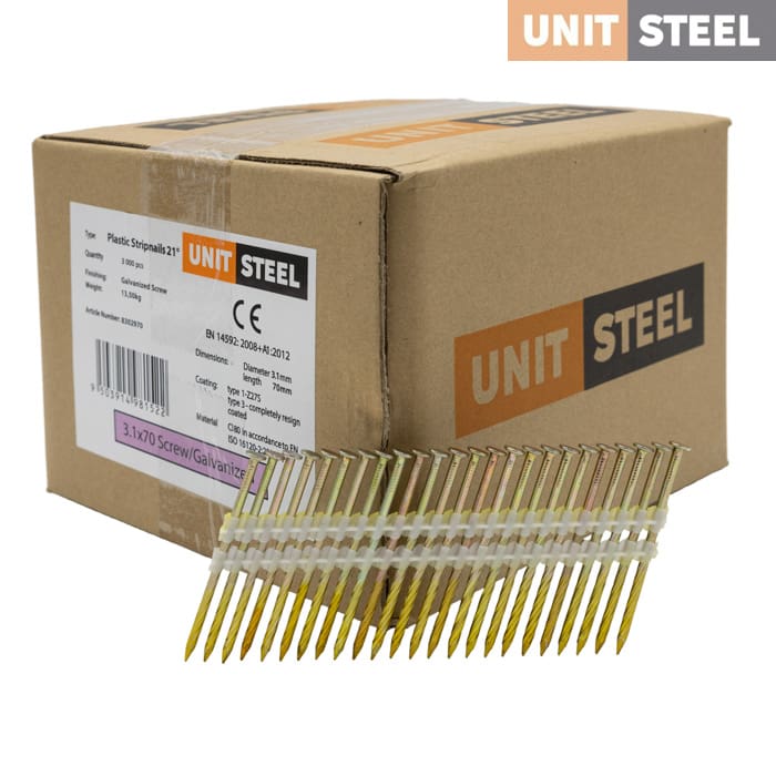 De Unitsteel RK Stripnagels 21º zijn spijkers op een strip die geschikt zijn voor tackers van diverse merken. Ze worden veelvuldig gebruikt in de bouw- en timmerindustrie. Enkele voorbeelden van toepassingen waar deze stripnagels geschikt voor zijn zijn: Dakkapellen, Houtskeletbouw en Prefab bouw. De stripnagels zijn verkrijgbaar in lengtes tussen de 50 tm 160mm en zijn verkrijgbaar in gegalvaniseerd – en blank staal. Daarnaast zit er nog verschil in het type schacht. Er zijn nagels met een gladde schacht, een geringde schacht en een geschroefde schacht. Voor vragen en advies kunt u altijd contact met ons opnemen.