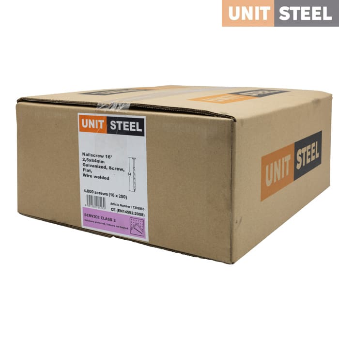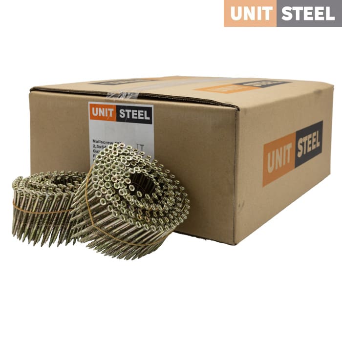 De Unitsteel Schietschroeven zijn universele spijkers van gegalvaniseerd staal met een geschroefde schacht. Door deze geschroefde schacht zijn bevestigingen erg stevig en betrouwbaar. De dikte is 2,5mm en de lengte varieert tussen de 45 en 65mm. Ze zijn geschikt voor coilnailers van verschillende merken.