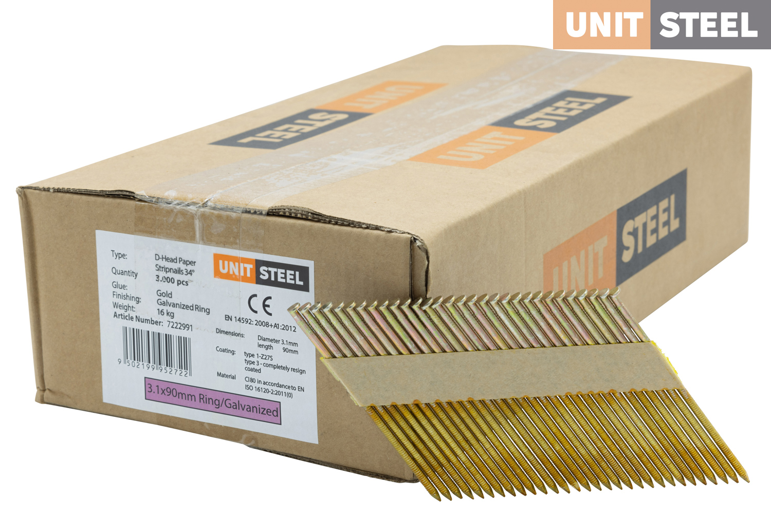 UnitSteel 34° Stripnagels D-KOP 3,1X90mm Ring/Gegalvaniseerd 3.000 stuks