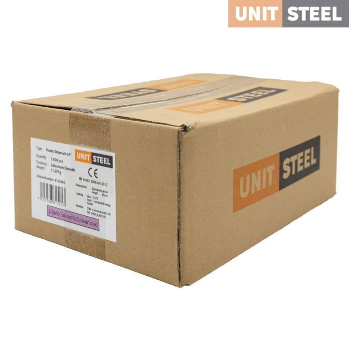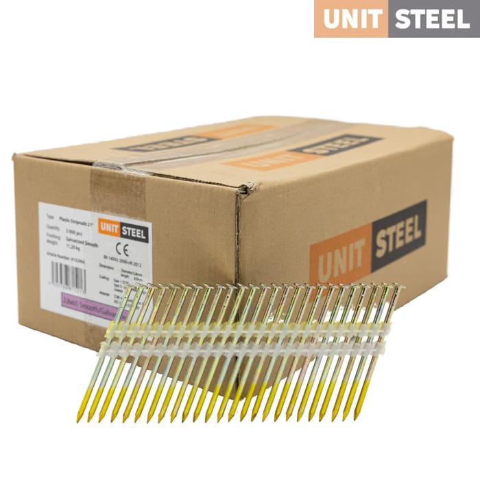 De Unitsteel RK Stripnagels 21º zijn spijkers op een strip die geschikt zijn voor tackers van diverse merken. Ze worden veelvuldig gebruikt in de bouw- en timmerindustrie. Enkele voorbeelden van toepassingen waar deze stripnagels geschikt voor zijn zijn: Dakkapellen, Houtskeletbouw en Prefab bouw. De stripnagels zijn verkrijgbaar in lengtes tussen de 50 tm 160mm en zijn verkrijgbaar in gegalvaniseerd – en blank staal. Daarnaast zit er nog verschil in het type schacht. Er zijn nagels met een gladde schacht, een geringde schacht en een geschroefde schacht. Voor vragen en advies kunt u altijd contact met ons opnemen.