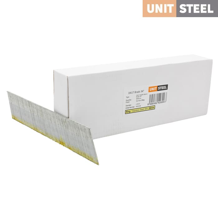 UnitSteel Da Brads 1,8x38mm RING /RVS : Deze Da Brads van UnitSteel met een lengte van 38mm en een hoek van 34 graden bieden uitstekende bevestiging voor verschillende toepassingen, zoals het bevestigen van glaslatten, plinten, afwerklijsten en andere houtbewerkingstoepassingen in krappe ruimtes. Betrouwbare en duurzame oplossing voor professionele resultaten.