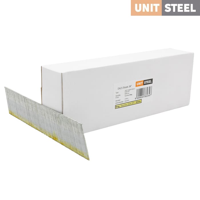 UnitSteel Da Brads 1,8x50mm RING /RVS : Deze Da Brads van UnitSteel met een lengte van 50mm en een hoek van 34 graden bieden uitstekende bevestiging voor verschillende toepassingen, zoals het bevestigen van glaslatten, plinten, afwerklijsten en andere houtbewerkingstoepassingen in krappe ruimtes. Betrouwbare en duurzame oplossing voor professionele resultaten.