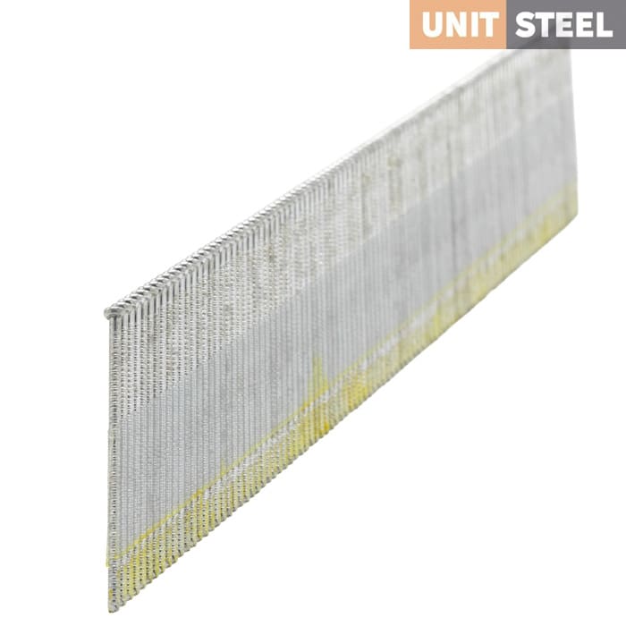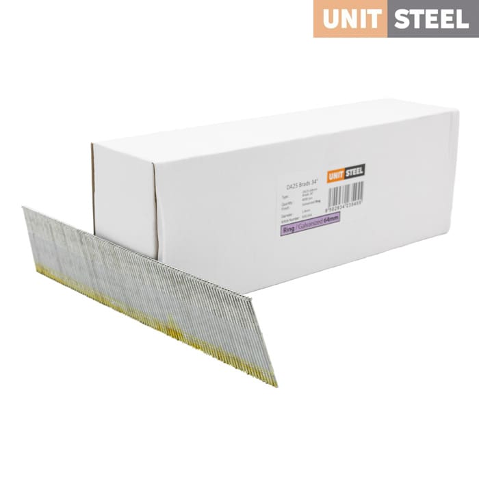 UnitSteel Da Brads 1,8x64mm Ring Gegalvaniseerd: Deze gegalvaniseerde Da Brads van UnitSteel met een lengte van 64mm en een hoek van 34 graden bieden uitstekende bevestiging voor verschillende toepassingen, zoals het bevestigen van glaslatten, plinten, afwerklijsten en andere houtbewerkingstoepassingen in krappe ruimtes. Betrouwbare en duurzame oplossing voor professionele resultaten.