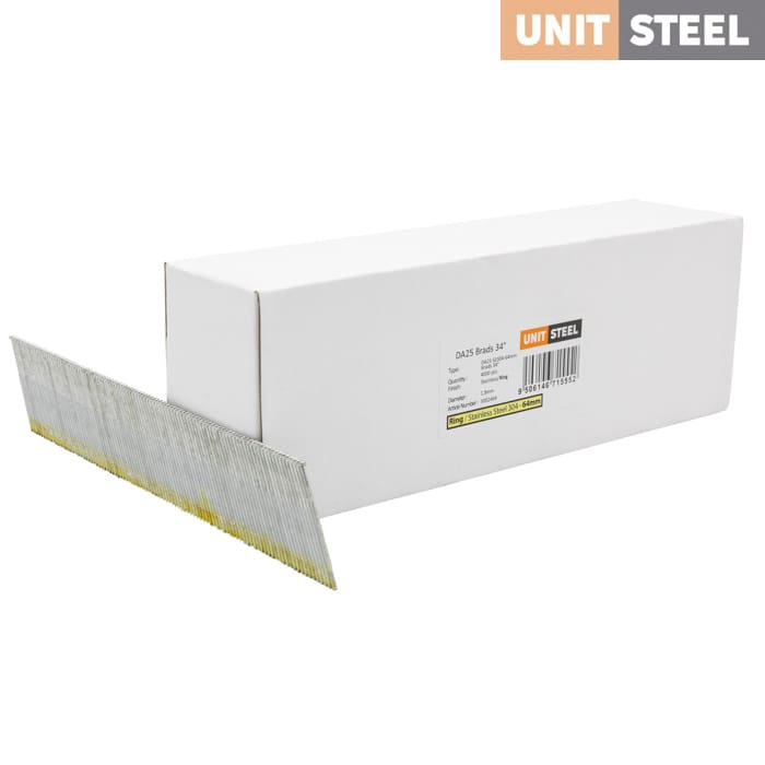 UnitSteel Da Brads 1,8x64mm RING /RVS : Deze Da Brads van UnitSteel met een lengte van 64mm en een hoek van 34 graden bieden uitstekende bevestiging voor verschillende toepassingen, zoals het bevestigen van glaslatten, plinten, afwerklijsten en andere houtbewerkingstoepassingen in krappe ruimtes. Betrouwbare en duurzame oplossing voor professionele resultaten.